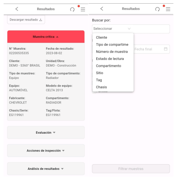 Puede descargar los informes en PDF directamente desde la aplicación. También puede filtrar la búsqueda de resultados (sitio, tipo de compartimento, compartimento).